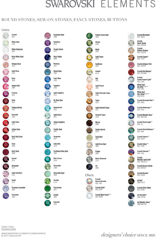 PRINT CATALOG SHEETclick-on PDFSwarovski® Color Chart PDFIMPORTANT All styles do not come in all colors or finishes. Vintage and some out of stock colors are not shown. This chart is provided as a general color reference only.