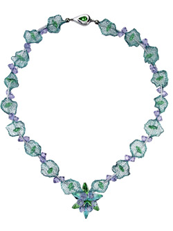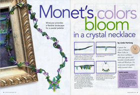 Monet's colors bloom in this mesmerizing necklace you can make. A palette of colors in shades of teal, green and violet Swarovski crystals come together to create the ‘water lily' focal piece. Tiny Italian glass silver seedbeads and small round green ‘lily pad' crystals weave through waves of Turquoise WireLace™ culminating in an elegant crystal teardrop shaped clasp. Frame your face with this lovely piece of art. All components are nickel-free. Details and closeup